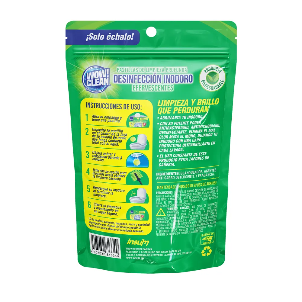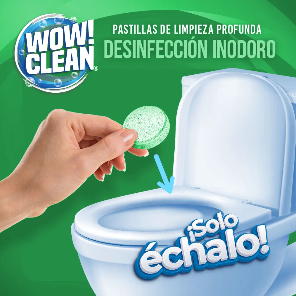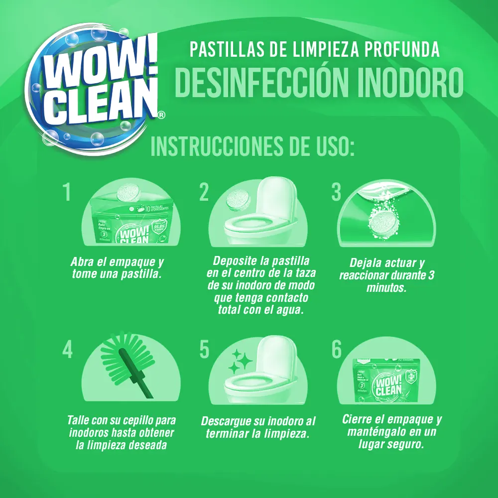 Solo abre la bolsa, toma una pastilla y depositala dentro de la taza, déjala actuar por 3 minutos, talla con tu cepillo para baño, descarga y listo. Experimenta la limpieza y aroma WOW CLEAN!