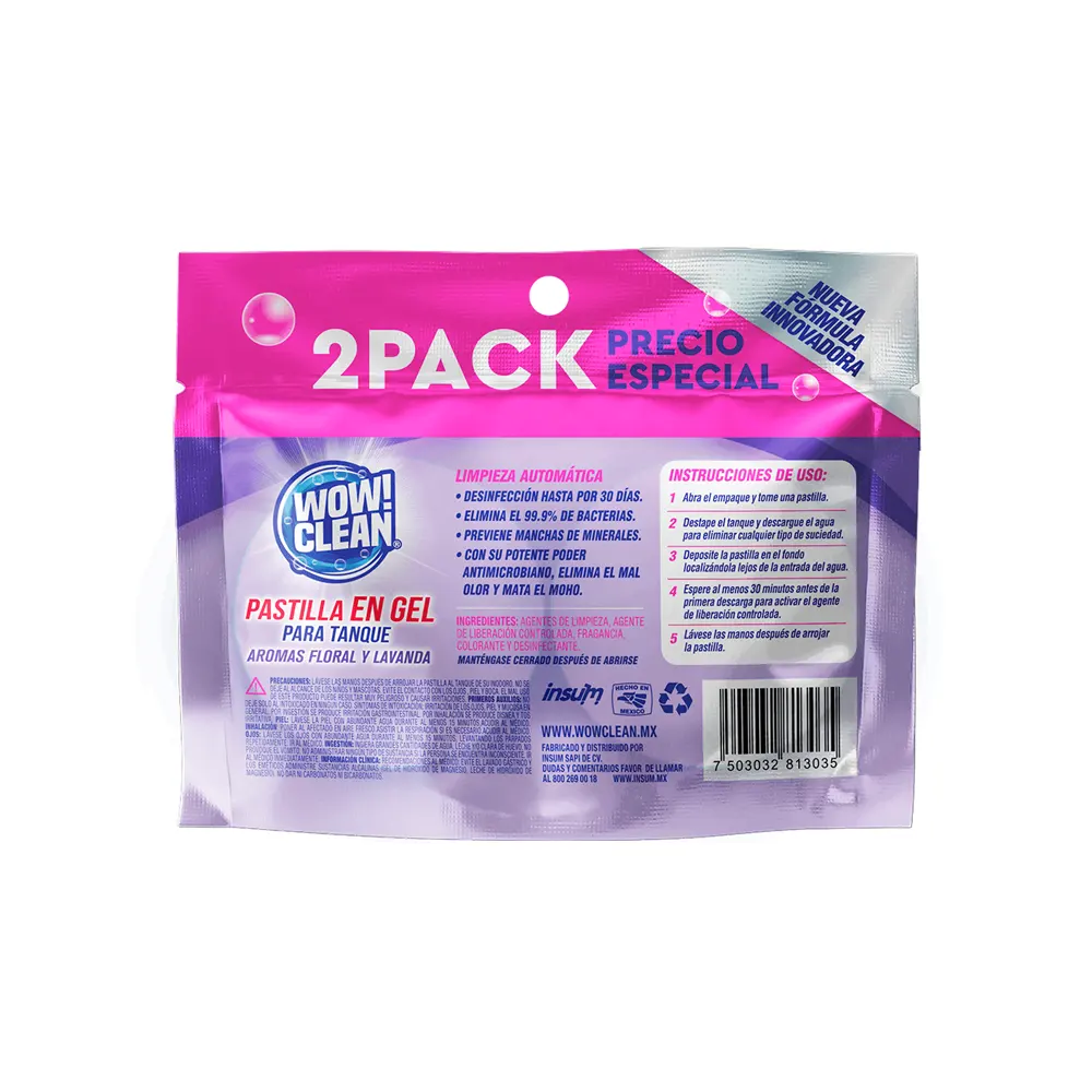 Pastillas en gel aroma floral y lavanda, con su poderosa fórmula de disolución lenta, garantiza desinfección y limpieza automática en cada descarga para tu inodoro. . Solo abre la bolsa, deposita la pastilla en el tanque, cierra y listo. Experimenta la desinfección WOW CLEAN!